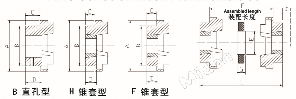 3、 聯(lián)軸器的內(nèi)徑分為:直孔式(B型)、錐孔式(F、H型),具有更換拆裝便捷準確的優(yōu)點。