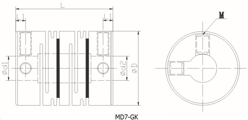 | 型號 Model | d1/d2 | D | L | L1 | F | M | 擰緊力矩 | 額定扭矩 | 最大扭矩 | 最高轉速 | 慣性力矩 | 靜態扭矩剛性 | 徑向偏差 | 角向偏差 | 軸向偏差 | 重量 |