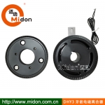 邁動工業牙嵌式電磁離合器----借助通入磁軛內勵磁線圈中的電流產生磁力吸引銜鐵,從而使與磁軛和銜鐵相連的兩上牙形齒爪接合傳遞轉矩。牙嵌式電磁離合器可分為線圈旋轉(有滑環式)和線圈靜止(無滑環式)兩種,前一種的勵磁線圈回轉,電流經滑環引入,后一種勵磁線圈靜止,電流直接通入線圈。為了使離、合容易,一般采用三角形牙或梯形牙。